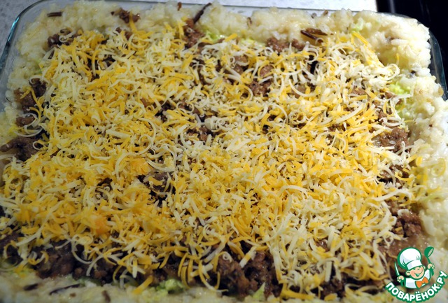 Следующий слой это сырно-луковый и опять фарш