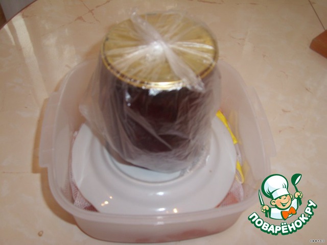 Рыбу кладу под гнет. Под гнет подойдет любая банка с содержимым, что есть в холодильнике, ставим её в целлофановом пакете для гигиены. Убираем засоленную рыбу в холодильник.