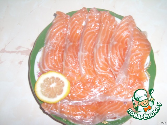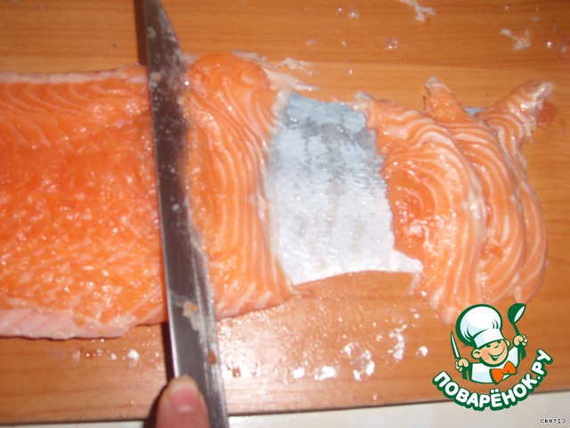 Засоленная рыба получается сочная и, как бы мы не резали, очень тонкая.