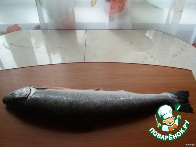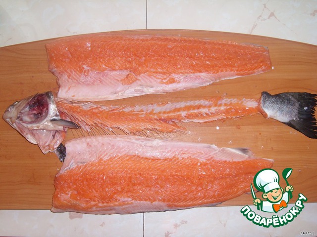 Разделываем. Вынимаем жабры. Один пласт филе рыбы пойдет на засолку, второй на запекание, а голову, кожу, плавники, кости мы используем на японский супчик.