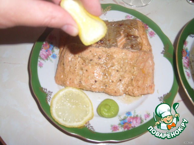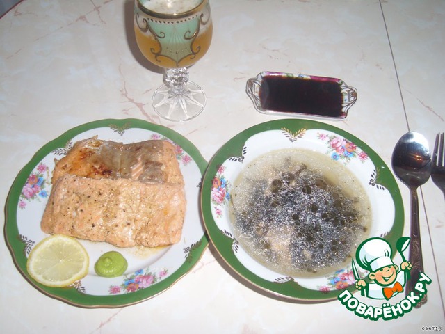 Пока заправляли супчик, запеклась рыба. Выкладываем, сбрызгиваем соком лимона. Вкусно есть такую рыбу с соевым соусом, японской горчицей васаби и неплохо бы маринованный имбирный корень от ОЛИВЫ7777 http://www.povarenok.ru/recipes/show/9188/.
