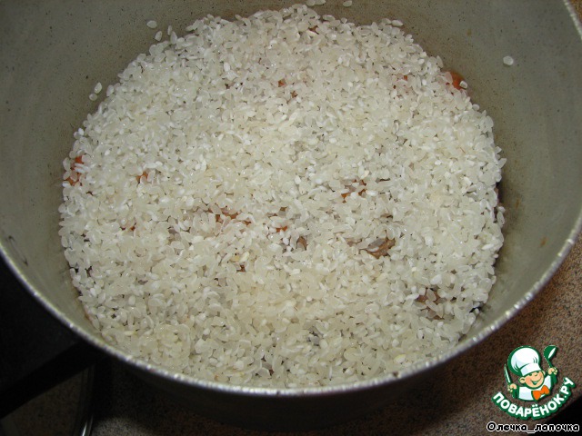 Поверх фарша выложить половину промытого риса, равномерно распределить по поверхности, посолить.