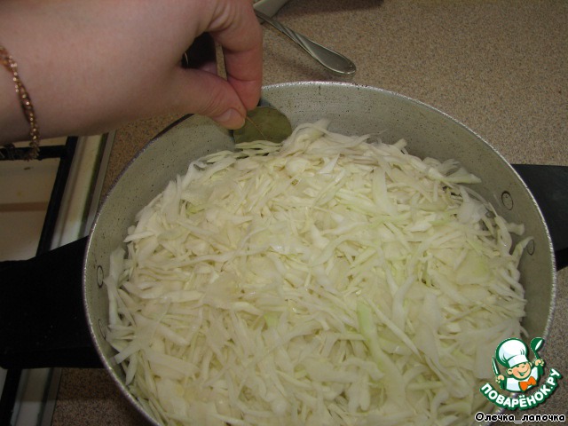Повторяем слои. Последний должен быть слой из капусты. Между стенкой кастрюли и содержимым вложить с разных сторон лавровые листики.
