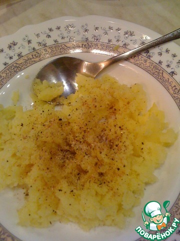 Добавить к натертой картошке соль, перец, мускатный орех и любимую приправу (у меня с белыми грибами)