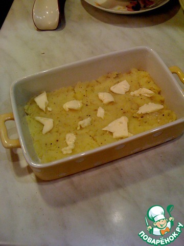 Перемешать и переложить в смазанную сливочным маслом форму, сверху положить хлопья сливочного масла, немного