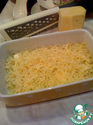 Добавить натертый на крупной терке сыр и запекать в разогретой до 200 градусов духовке минут 15, я поставила под гриль