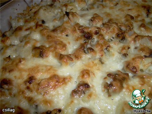 Сверху выложить грибы с луком. Можно перемешать, но я не перемешивала.