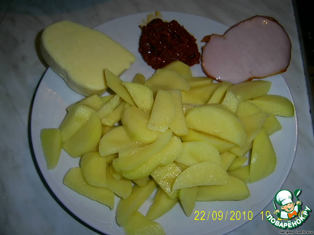 Копченое филе свинины нарезать соломкой и положить на картофель. Немного посолить.
