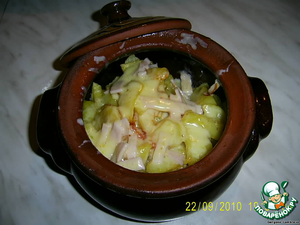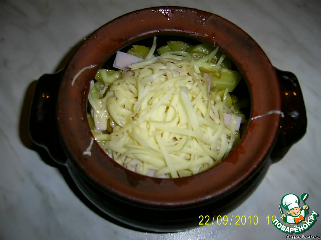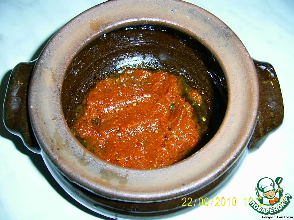 На дно горшочка положить лютеницу /можно заменить на кетчуп /
