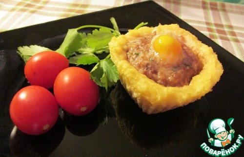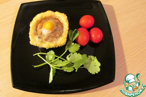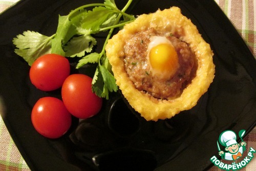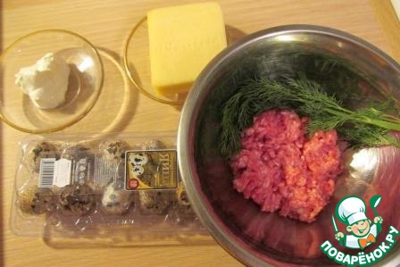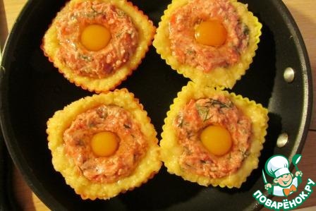 В фарше любым подручным инструментом или просто пальчиком делаем углубление, в которое аккуратненько разбиваем перепелиное яичко.