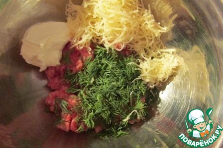 Сыр натираем, укроп измельчаем, вместе со сметаной и яйцом добавляем к фаршу, всыпаем мускатный орех, соль и перец.