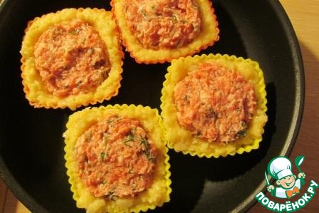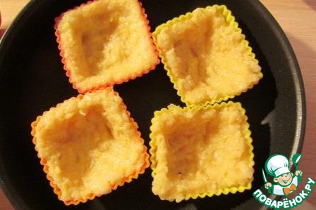 Рисовую массу выкладываем по дну и бокам формочек. Если формочки силиконовые, смазывать маслом их не будем; если металлические - смазываем маслом или прокладываем бумажными вставками.