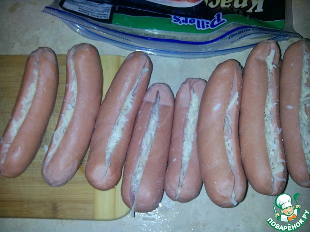 В это время подготавливаем начинку из сарделек с сыром. Для этого очищенные от оболочки сардельки надрезаем посередине, не доходя до краев.