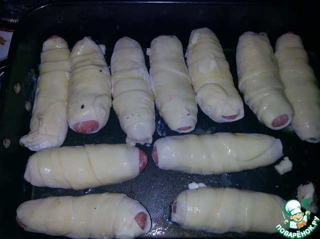 Все подготовленные таким образом сардельки в тесте укладываем на смазанный маргарином противень.