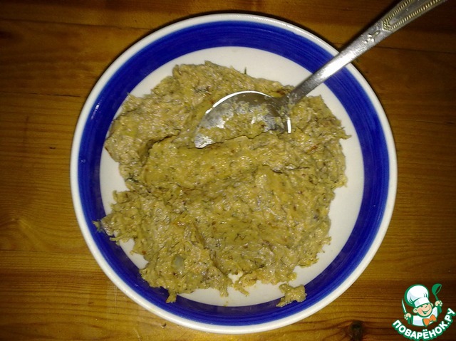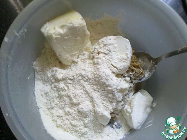 Смесь, сметану, муку, размягченный маргарин соединить, посолить, хорошо перемешать.
