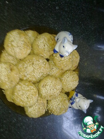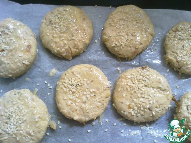 Тесто раскатать в пласт толщиной 1,5 см. Стаканом вырезать кружки. Выложить на смазанный противень. Сверху смазать взбитым яйцом и посыпать кунжутом.