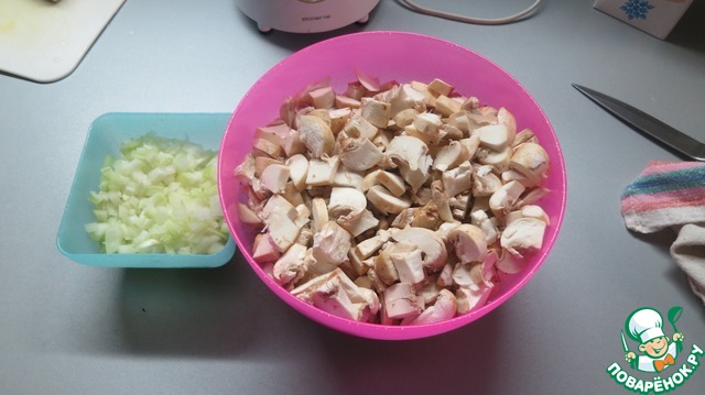 Шампиньоны моем (просто смыть грязь, если есть) не чистим, если нет желания. Режем кусочками. Размер не имеет значения.