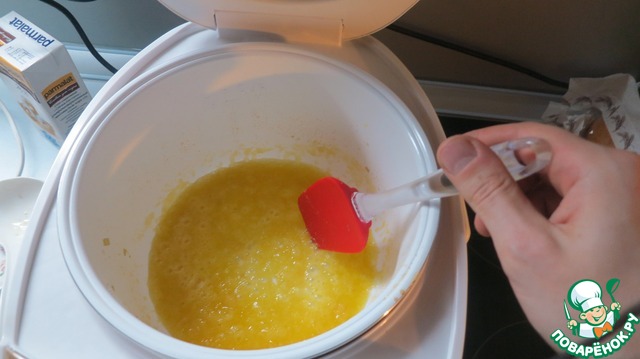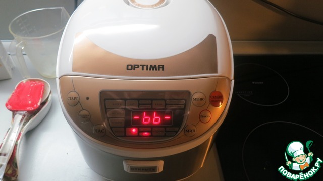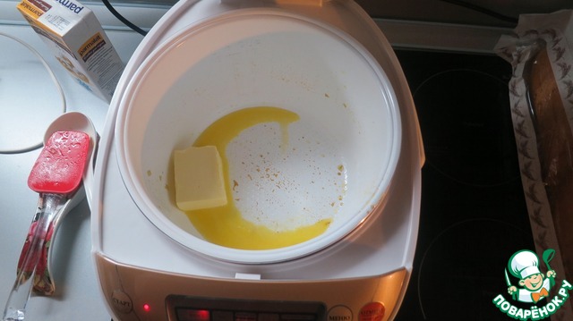 Отрезаем часть от отмеренного сливочного масла (около пятой части) для обжарки, помещаем в мультиварку. Включаем её в режим "Жарка". Таймер на 15 мин.