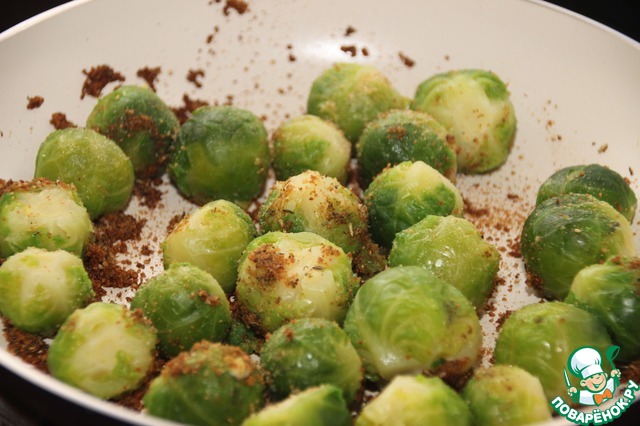 Брюссельскую капусту отварить в соленой воде примерно 7-8 минут до полуготовности. Слить и отставить.
