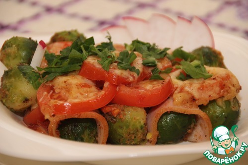При подаче можно оформить зеленью петрушки и редисом. Наша ароматная брюссельская капуста готова! Приятного аппетита!