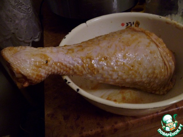 Голень индюшки помыть. Натереть солью и специями по вкусу. Во внутрь (либо делаем разрез около кости, либо так) вставляем 2 почищенные дольки чеснока. В отдельной тарелочке смешать горчицу и кетчуп. Натереть смесью из кетчупа и горчицы голень и оставить в сторонку мариноваться…