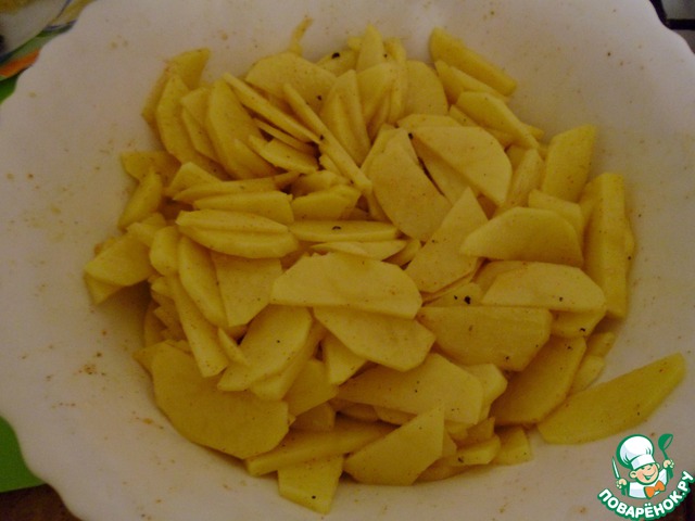 Почистить картофель, помыть, нарезать средней толщиной (у меня получается где-то по 2-3 мм). Добавить в порезанный картофель соль и специи (я использовала сухой чеснок, кенийский перец, черный перец) добавить масло (3 ст. л.) и перемешать.