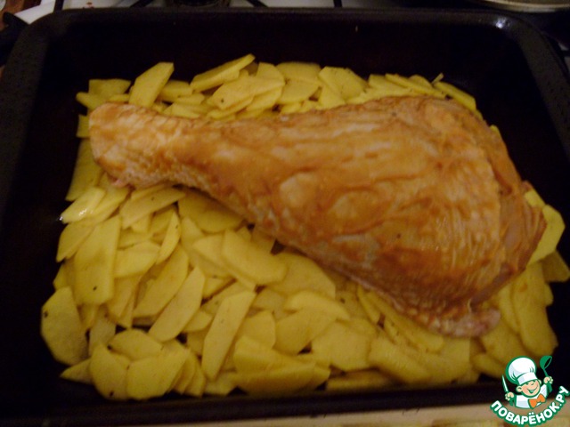 На противень налить 2 ст. л. масла (на самом деле можно и на глаз…), выложить картофель, сверху уложить уже промаринованный голень индейки, накрыть фольгой (так чтобы края были подвернуты под стенки протвиня) и убрать в духовку на 60 минут.