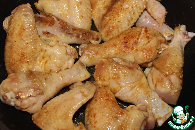 Смешать в отдельной посуде все специи, добавить оливковое масло и все хорошенько перемешать. Натереть специями подготовленную курицу (у меня голень и крылья).