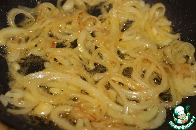 Затем достаем курицу из сковородки в отдельную тарелку, а в сковородку отправляем лук и жарим его до золотистого цвета.