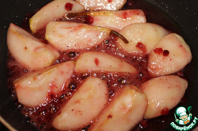 А тем временем займемся грушами, их нужно очистить от кожицы и разрезать на 4 части, не забыв удалить семена. На сковородке растопить масло и добавить груши, мед, брусничный соус и готовим 5 минут, осторжно переворачивая груши.