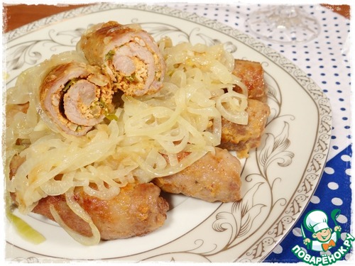 | Предлагаю Вашему вниманию вкусные рулетики из свинины с ароматной начинкой и большим количеством поджаренного лука. Моя семья была в восторге от этого блюда! За рецепт благодарю польского кулинара Беату. |