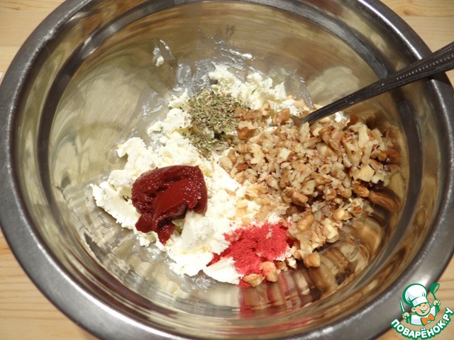Добавляю томатную пасту, порубленные грецкие орехи, сушеный орегано, сладкую паприку.