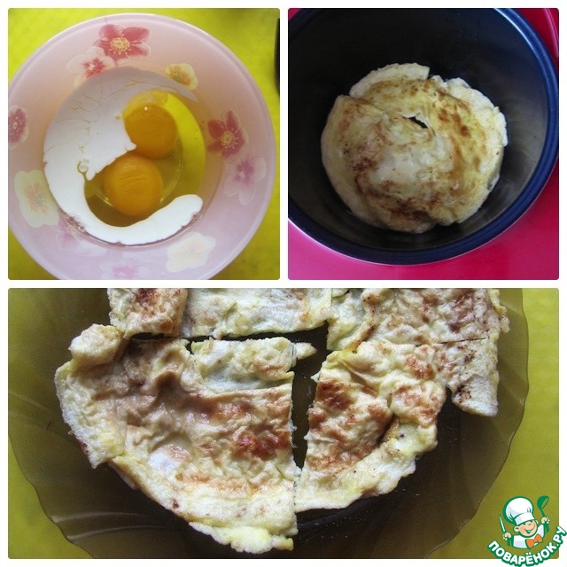 Взбить яйца с молоком. Включить мультиварку, режим "Поджаривание", выложить сливочное масло, вылить яично-молочную смесь, поджарить омлет с двух сторон, охладить, разрезать на порции.