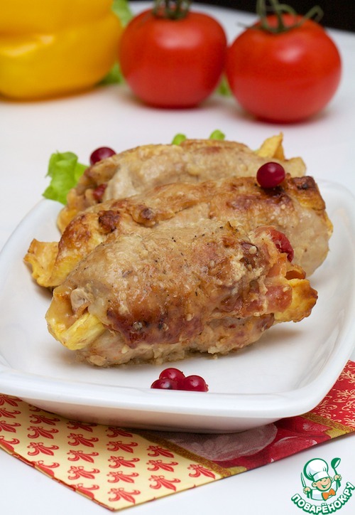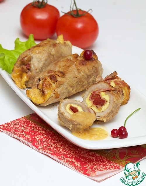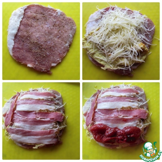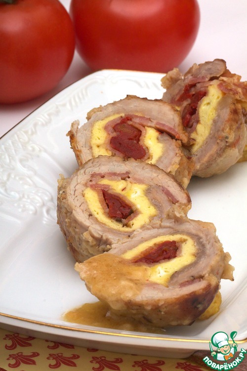 На отбитый кусок свинины выложить порцию омлета, тертого сыра, полоски бекона, на край выложить вяленые томаты, плотно свернуть рулетом.