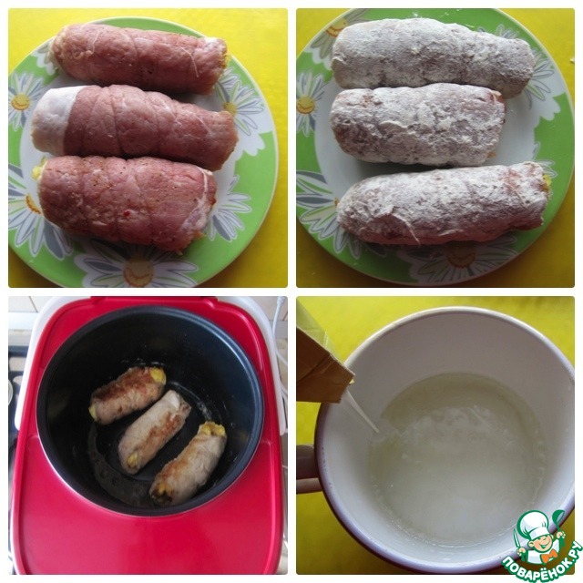 Каждый рулет связать кулинарной нитью, обвалять в муке. Выбрать на мультиварке режим "Поджаривание", разогреть растительное масло, обжарить рулеты до румяной корочки со всех сторон. Выключить программу. Соединить сливки и бульон, посолить по вкусу.