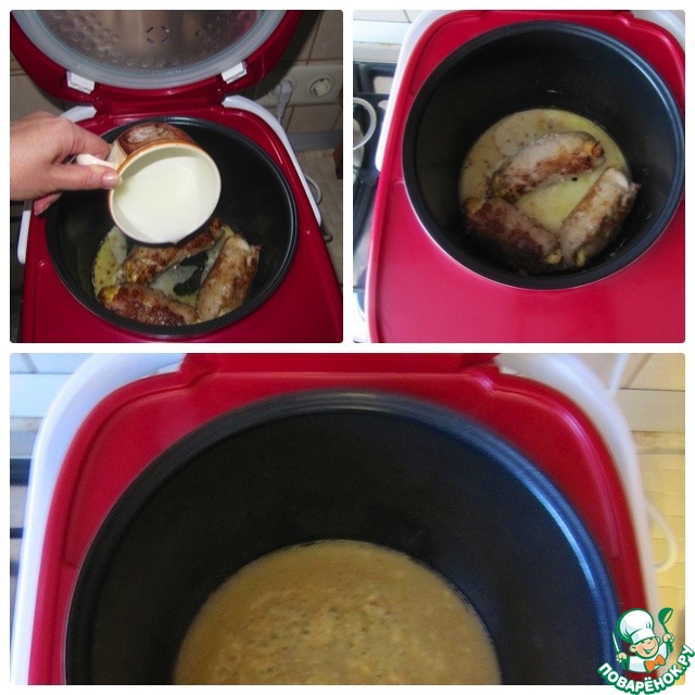 Залить сливками обжаренные рулеты. Далее готовить в режиме "Тушение" 20-30 минут. Выложить рулеты на теплую тарелку, снять нитки, накрыть фольгой. Если соус получился жидким, то в режиме "Поджаривание" в течение нескольких минут выпарить лишнюю влагу. Соус переложить в соусник, подавать немедленно!