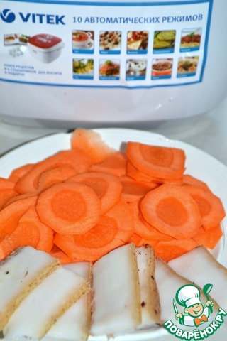 Морковь порезать кружочками, сало - тонкими ломтиками.