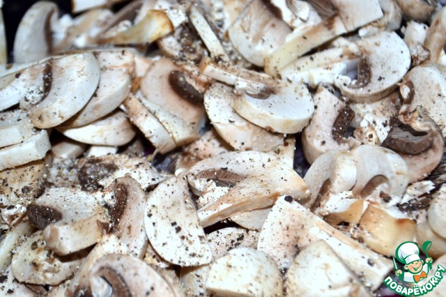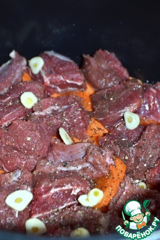 На мясо выкладываем порезанный чеснок. Солим и перчим - по вкусу.
