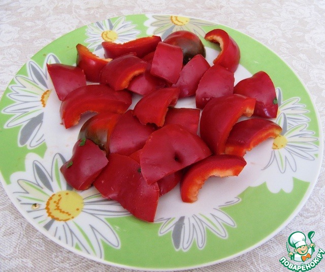 Болгарский перец очистить от семечек, нарезать широкими полосками.