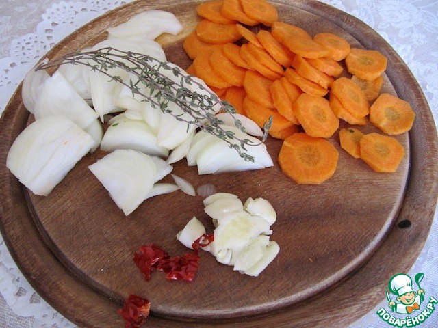 Чеснок очистить, раздавить ножом, очищенную морковь нарезать кольцами, очищенный лук - полукольцами, жгучий перец очистить от семян. Тимьян у меня сушенный.