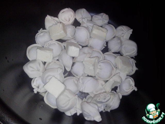Пельмени, не размораживая, высыпать в кастрюлю мультиварки. Сливочное масло нарезать небольшими кусочками и выложить на пельмени.