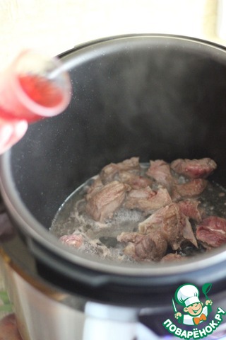 К мясу добавляем вино и в этом же режиме тушим до испарения жидкости.
