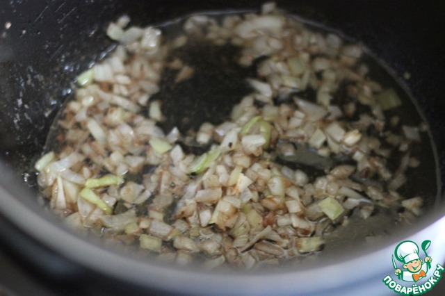Затем мясо вытаскиваем, а в оставшийся жир от жарения выложить лук и готовить в режиме «Meat» в течение 5 минут