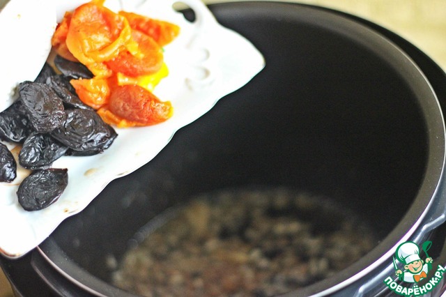 Затем все тщательно перемешать, добавить чернослив и курагу, баранину