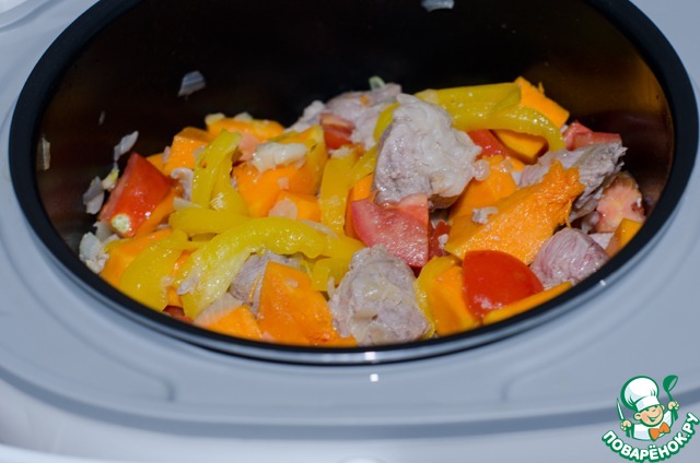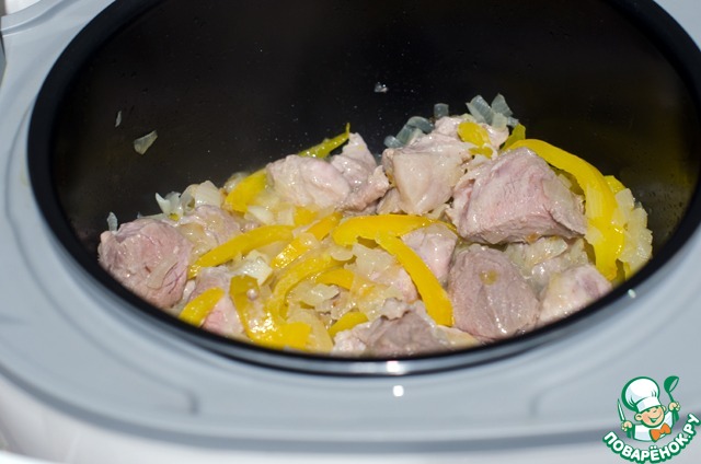 Как только время программы Жарка истекло, в мясо влить теплую воду и выбрать программу Тушить, установить время 60 минут. Закрыть крышку мультиварки.