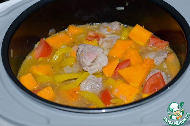 Пока мясо обжаривается нарезать тыкву и помидоры на кусочки.