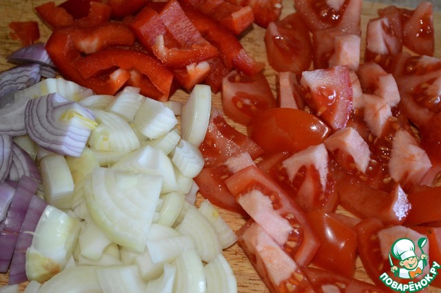 Лук очистить и вместе с перцем и помидорами нарезать толстыми четвертушками.
