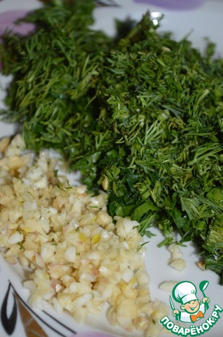 Чеснок очистить, раздавить и измельчить. Укроп с петрушкой вымыть, высушить и измельчить.
