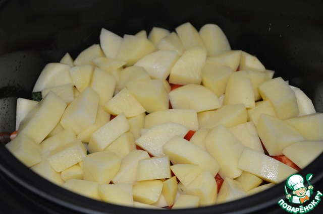 Когда мясо обжарится разровнять его лопаткой и выложить на него овощи в следующей последовательности: лук посолить и посыпать специями, морковь, помидоры, зелень которую посыпать чесноком, перец и последним слоем выложить картофель. Закрыть крышкой и установить программу ТУШЕНИЕ на 80 минут.