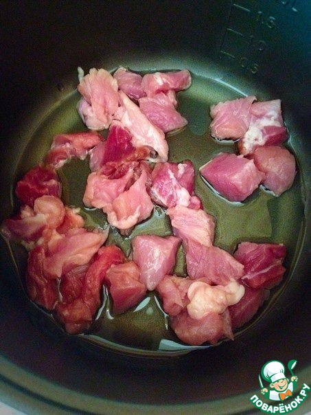 Промытое мясо нарежьте кубиками. Положите в чашу мультиварки. Обжарьте мясо в мультиварке: включите режим Жарка на 15 минут.